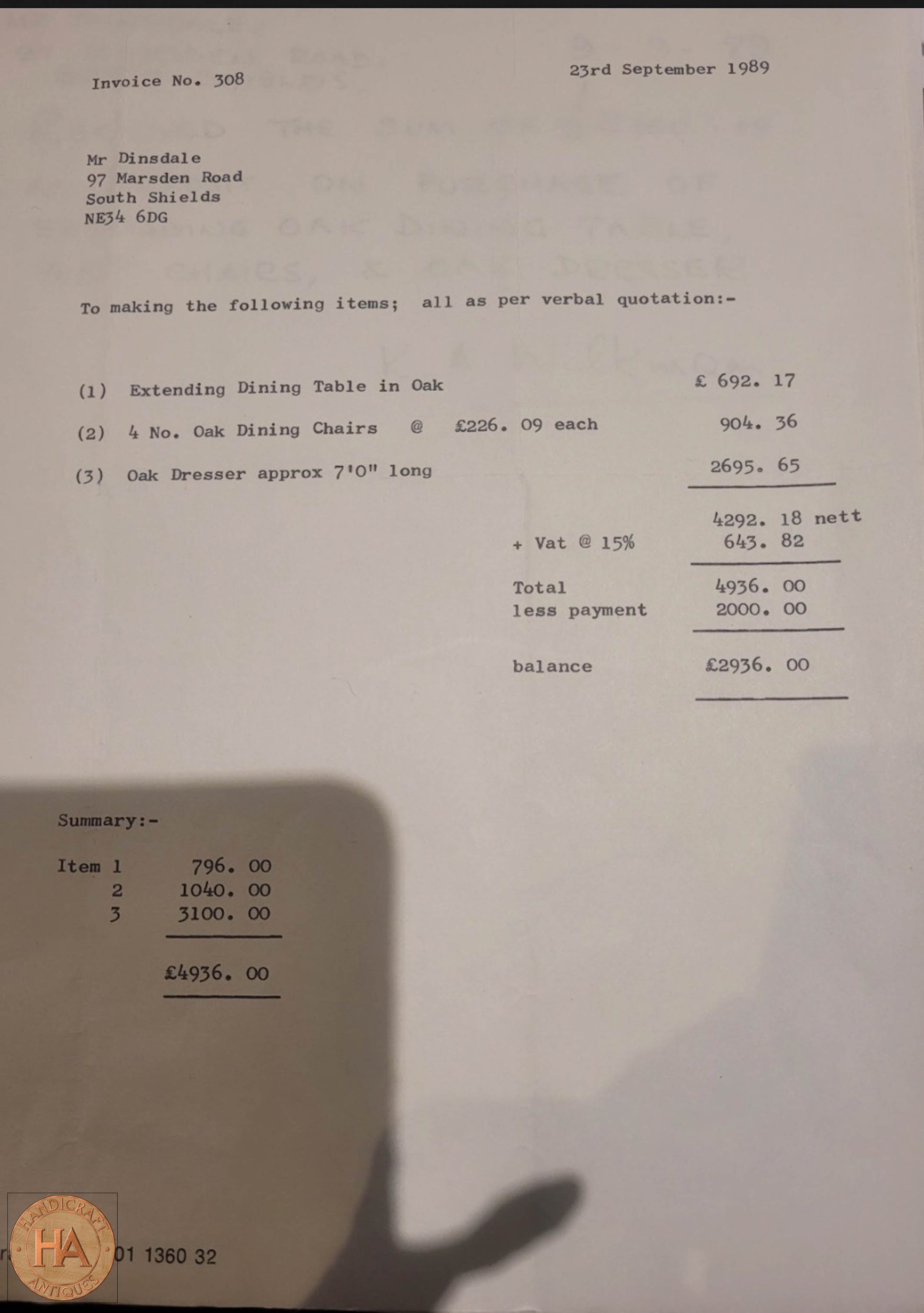 Unmarked, but part of a set made for the previous owner who had an electronic copy of the original receipt (the chairs costing £904 in 1989!).